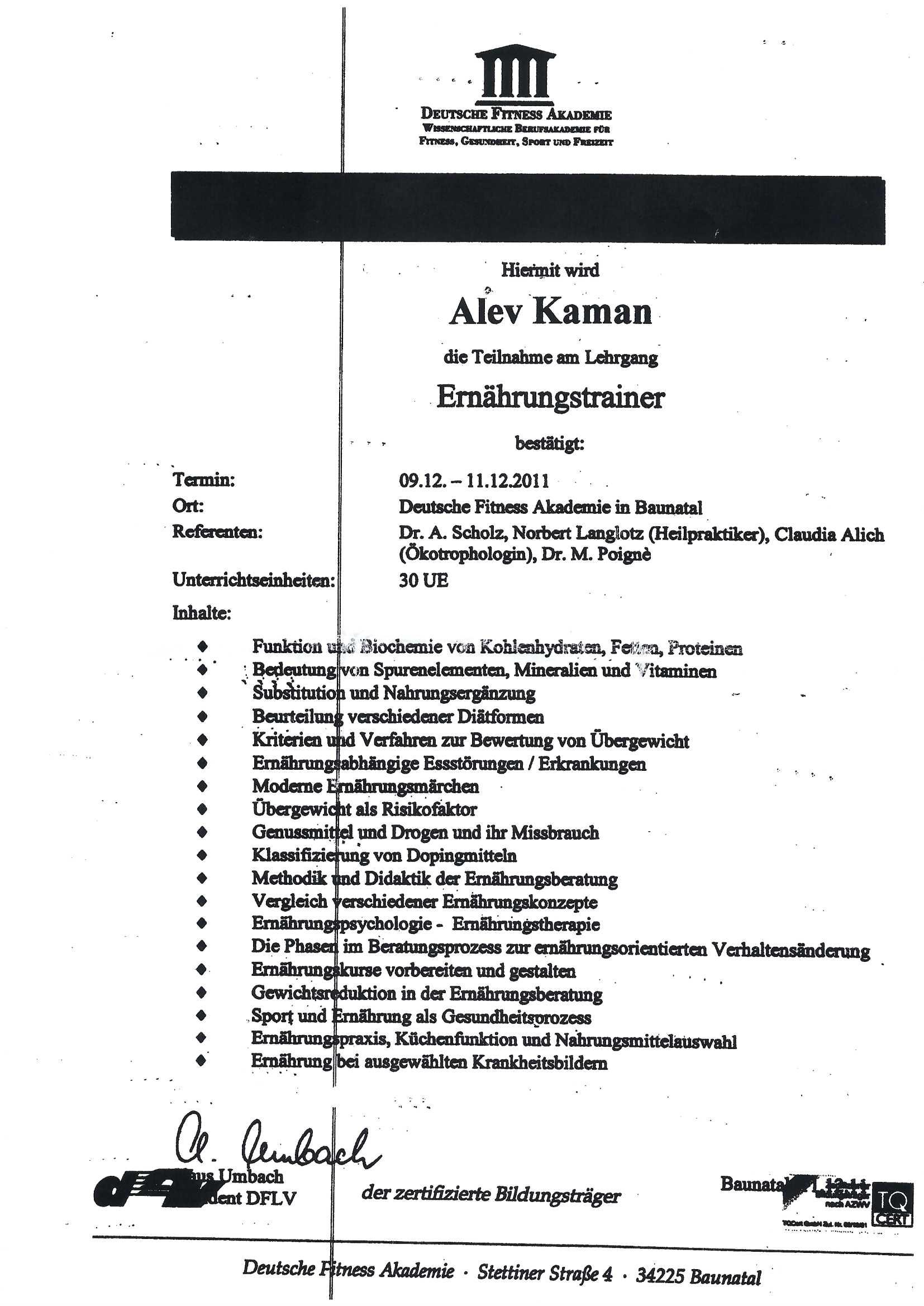 „Alev ist eine sehr professionelle Trainerin, die genau weiß, was sie tut. Man bemerkt, dass sie sehr viel Fachwissen besitzt. Sport im Betrieb macht uns mit ihr sehr viel Spaß. Sie ist sehr zuverlässig und der Krankenstatus der Mitarbeiter ist durch ihr Angebot gesunken. Die Kollegen freuen sich jede Woche auf unsere Trainerin Alev"